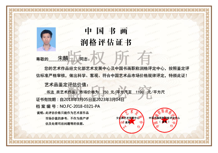 朱麟,自幼酷爱美术,儿时曾在天津市少年宫学习.毕业于天津师范大学艺术设计系,后自已创业经营字画工艺品生意.本人作品经常受到国内外友人好评并收藏.现为中国书画家协会会员
